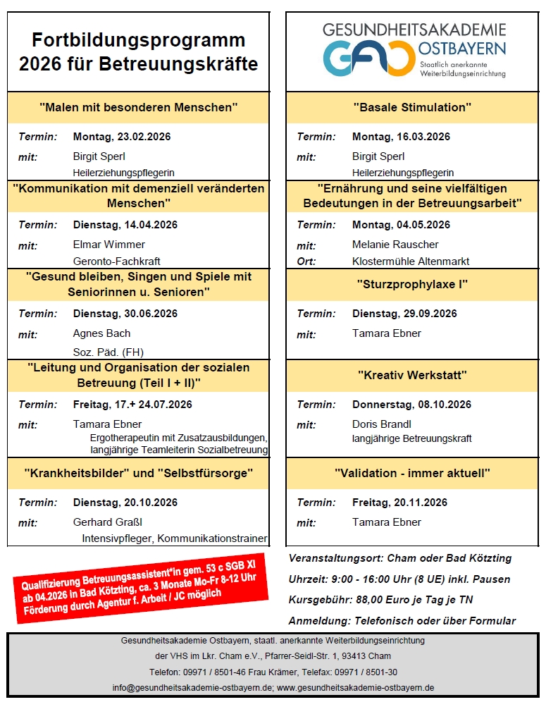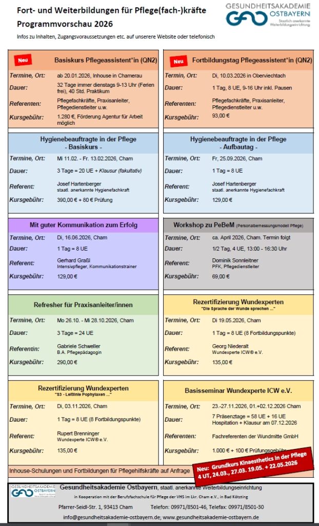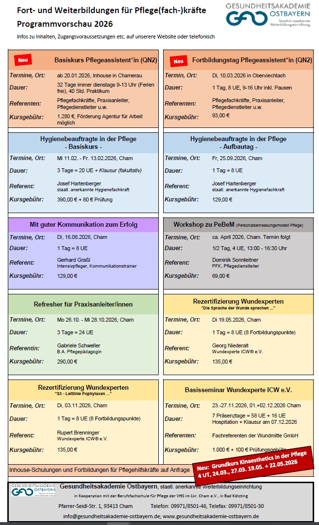 In Berufen, die nah am Menschen arbeiten, ändern sich Methoden, Fachwissen und Erkenntnisse stets. Wenn Sie auf dem aktuellen Stand bleiben möchten oder sich für eine weitere berufliche Ebene qualifizieren möchten, sind Sie bei uns, der Gesundheitsakademie Ostbayern, richtig!