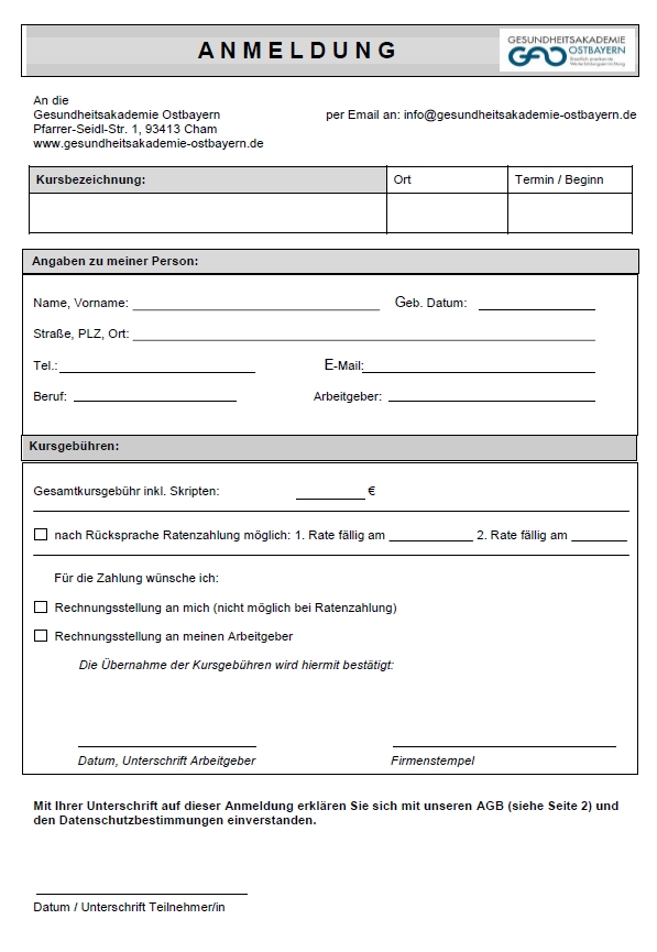 Die Anmeldungen werden von der Gesundheitsakademie Ostbayern in zeitlicher Reihenfolge angenommen.